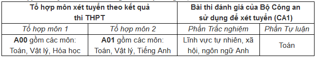 – Phương thức 3: Xét tuyển theo kết quả thi tốt nghiệp THPT theo các tổ hợp (A00, A01) kết hợp với kết quả Bài thi tuyển sinh trình độ đại học CAND chính quy tuyển mới theo tổ hợp (CA1), gọi tắt là bài thi Bộ Công an.